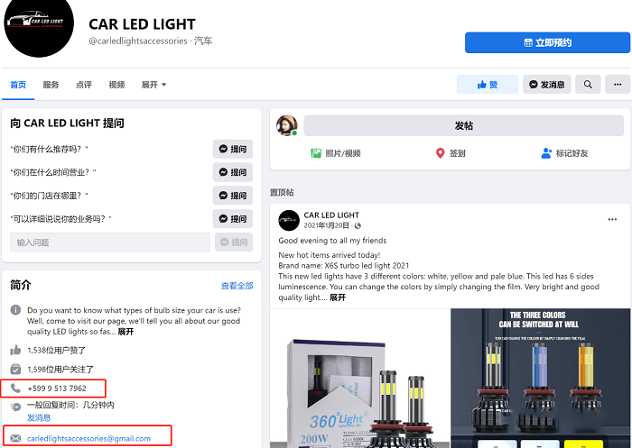 Facebook公共主頁(yè)顯示公司相關(guān)信息,例如地址、電話(huà)、郵箱、網(wǎng)站,等。