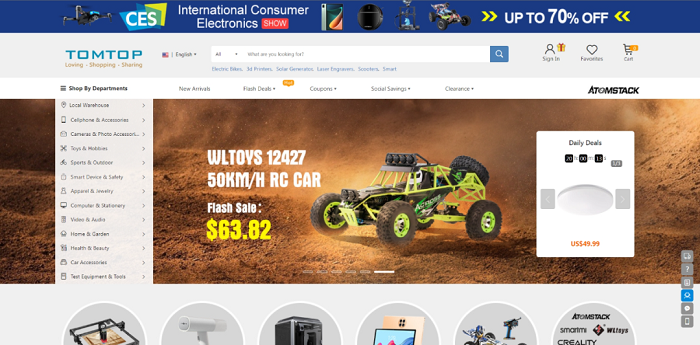 Tomtop主要經(jīng)營各種生活用品,專注于視頻游戲、電腦配件、手機(jī)配件、服裝、家居和花園用品、珠寶、媒體播放器、汽車配件、遙控模型和配件等,致力于把中國優(yōu)質(zhì)供應(yīng)鏈產(chǎn)品,通過eBay、亞馬遜、速賣通、敦煌、Wish等多種渠道銷售到全世界。