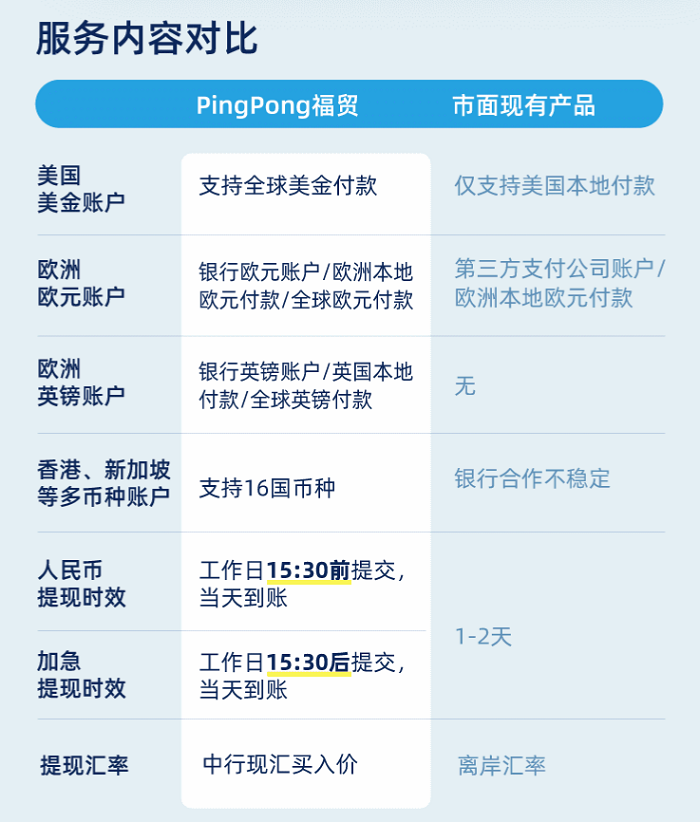 對比眾多第三方支付公司,我們支持全球美金付款,提供全球賬戶的快速開立,支持16個(gè)主流幣種的快捷收款,讓外貿(mào)企業(yè)低門檻、低成本享受全球賬戶帶來的便利,享受本地客服快速響應(yīng)。