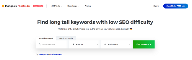 https://kwfinder.com/KWFinder除了能找到數(shù)百個(gè)長尾關(guān)鍵詞外,還會(huì)給出每個(gè)詞的搜索量和SEO難度。注冊賬戶后,有10天的免費(fèi)試用。