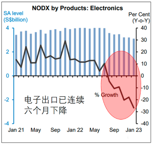 2023年1月份,新加坡關(guān)鍵的非石油國內(nèi)出口(NODX)同比大跌25%,創(chuàng)2013年以來最大單月跌幅,跌幅大于市場預(yù)期,連續(xù)兩個(gè)月跌幅超過20%,并且連續(xù)四個(gè)月下降。